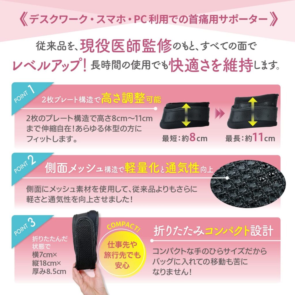 首と肩の痛みが我慢できなくなり、首サポーターを購入しました。この商品を選択した理由は、医師監修で信頼できたことと、高さ調整が可能だったことです。以前に類似品を購入したことがあるのですが、サイズ感が合わず、支えとして不十分でした。この商品は2枚のプレート構造になっていて、マジックテープで調整でき、自分にぴったりの高さに合わせることが簡単にできました。デスクワークで使用しましたが、固定性が抜群で首と肩がとても楽でした。フチ部分がクッションになっているため、長時間使用してもあごや胸の部分も痛くありませんでした。また、素材がメッシュで通気性が良く、蒸れは感じませんでした。長時間使用しても快適に過ごせるため、重宝しそうです。